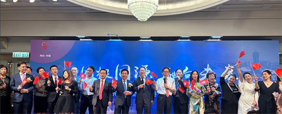 现场,拱墅区委统战部向区旅港同乡会赠送非遗传承人作品——彩绘扇《杭韵》,寓意着共同团结携手、拼搏奋斗的精神,象征着两地相融与共、源远流长的深厚情谊。随后,全场深情合唱《歌唱祖国》,表达对祖国的热爱和美好祝愿。
