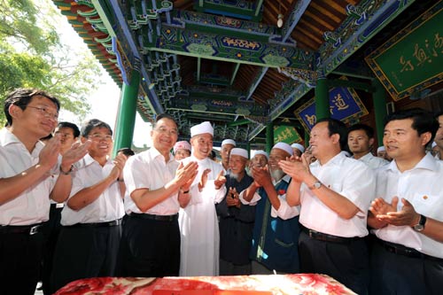 这是8月17日,温家宝来到具有悠久历史的银川纳家户清真寺,看望宗教人士和回族群众。