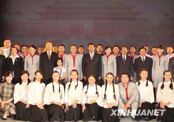 10月12日晚,大型文献故事展演《我们共同走过的路》在北京全国政协礼堂演出。中共中央政治局常委、全国政协主席贾庆林出席观看。这是演出结束后,贾庆林等走上舞台与演员合影。